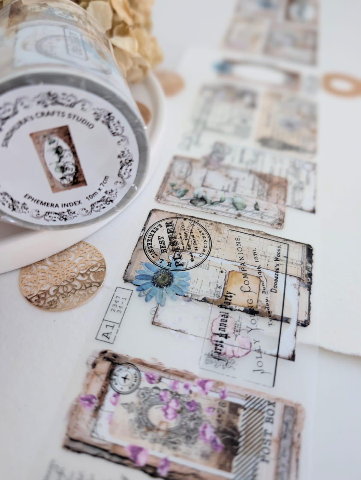 Ephemera Index is a carefully composed matte PET tape inspired by archived fragments old letters, postal marks, ledgers, stamps, tickets, and pressed botanicals gathered like memories in a personal index.